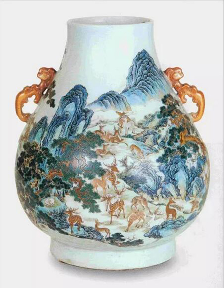 乾隆粉彩百鹿尊,口徑16厘米,底徑24.3厘米,高43.6厘米。收口,螭耳,圈足,腹部上斂下垂。造型獨(dú)特,形體規(guī)整,釉面勻凈,描畫極為精細(xì),且顏色鮮艷豐富。百鹿尊造型似鹿頭,康熙時(shí)期出現(xiàn),亦稱“鹿頭尊”,其上描繪百鹿,“鹿”字與“祿”諧音,有福祿、官祿之意。畫面中鹿的肢體、斑紋描繪真實(shí)生動(dòng),尤其是鹿身上的細(xì)毛,絲絲可見。背景中的山石、浮云意境高遠(yuǎn),將傳統(tǒng)國畫山石皴法運(yùn)用其中,表現(xiàn)出山峰的險(xiǎn)峻。百鹿尊耳施以珊瑚紅,粉中泛白,透出瓷身之色,質(zhì)感柔和。底足款識(shí)為“大清乾隆年制”六字三行篆書青花印章款。此器在乾隆、道光、光緒官窯均有燒造。