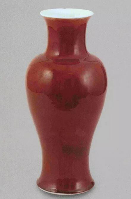 郎窯紅釉是康熙晚期景德鎮(zhèn)仿燒明代永樂、宣德時(shí)期鮮紅釉瓷器而產(chǎn)生紅釉新品種?滴跛氖哪曛廖迨荒辏餮矒峒婢暗骆(zhèn)御窯廠督理主持窯務(wù),由于清代官窯瓷器常以督陶官姓氏冠以窯名,所以在郎廷極為督陶官期間創(chuàng)燒的紅釉新品種,稱為郎窯紅釉。郎窯紅釉瓷器,以氧化銅為著色劑,生坯掛釉,入窯經(jīng)1300℃高溫再還原氣氛中一次燒成。郎窯紅釉瓷器造型以瓶、尊為主,尤以觀音尊最有特色,釉色鮮紅,顏色隨垂流逐漸加深,釉面清亮,玻璃質(zhì)感較強(qiáng),釉面有開片、鬃眼和牛毛細(xì)紋,口部釉薄露出胎骨白色,紅釉垂流通常不過底足,有“脫口垂足郎不流”之說,底足為“米湯底”或“蘋果綠底”,偶見紅釉底,一般不署款識(shí)。