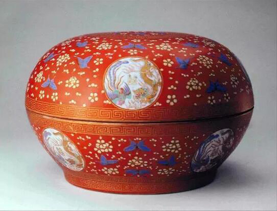 頤和園藏同治紅地粉彩開光龍鳳紋捧盒