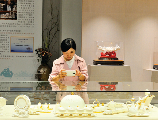 在中國白藝術(shù)宮展廳里,各類制作精美的日用家居瓷整齊地擺放著,其中,去年入選金磚國家領(lǐng)導(dǎo)人廈門會晤國宴瓷的《四海同心》系列作品尤為引人注目。這套系列作品主要包括餐具套裝、金磚元首杯、茶咖系列套裝和洗漱套裝等。“不論是餐廳里的餐具、酒具、咖啡具,還是書房里的文房用具,或是洗手間的洗浴用具,應(yīng)有盡有。”該系列作品創(chuàng)作者陳仁海笑著說。