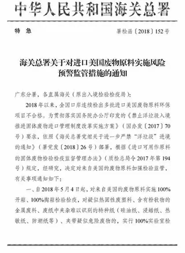 5月2日,國(guó)家海關(guān)總署發(fā)布特急文件《海關(guān)總署關(guān)于對(duì)進(jìn)口美國(guó)廢物原料實(shí)施風(fēng)險(xiǎn)預(yù)警監(jiān)管措施的通知》,提出5月4日起,對(duì)進(jìn)口美國(guó)固廢原料實(shí)施三方面的監(jiān)管。包括加強(qiáng)100%開(kāi)箱,100%掏箱檢驗(yàn)檢疫,對(duì)廢紙中夾雜難以識(shí)別的特種紙等廢物原料實(shí)行100%實(shí)驗(yàn)室檢測(cè)分析、對(duì)中國(guó)檢驗(yàn)認(rèn)證集團(tuán)北美有限公司實(shí)施A類風(fēng)險(xiǎn)預(yù)警措施、加強(qiáng)單證審核等三方面監(jiān)管。