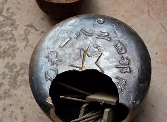 當時的情形,元小愛歷歷在目:“有木質(zhì)饸饹床、木勺、桌、椅、桿秤、紡花車、汽油桶、筷筒、鋼盔、日軍刺刀、子彈等。”當時,放在木桌一側(cè)角落下的一個破損黑釉瓷罐,也引起眾人的注意。布滿灰塵的瓷罐頂部出現(xiàn)缺口,其頂部中央有一顆五角星,周圍自左至右有“乙第一八二四部隊”字樣。這個陶瓷罐高27厘米,上圓面直徑33厘米,下圓底直徑31厘米,罐底無字。當時,由于罐體破損瓷片找不到,所以無法判斷罐頂是否還有其他字體缺失。