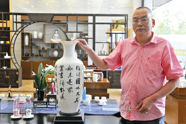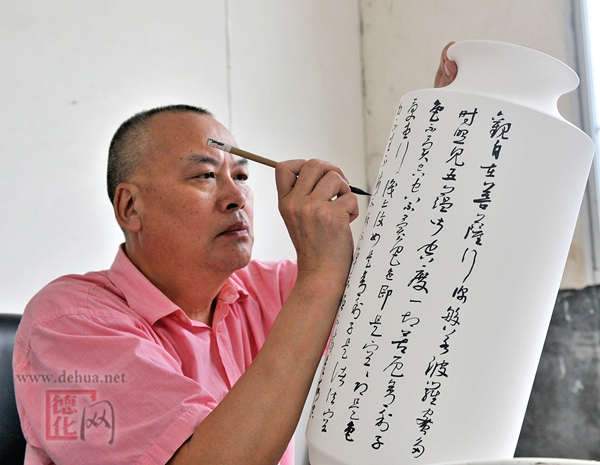 “當(dāng)時德化有在陶瓷上繪畫的,有對應(yīng)題詩詞的,但還沒有一個在陶瓷上進(jìn)行書法創(chuàng)作,使之成為一件完整的書法作品的,我因?yàn)橐恢痹趯懘勺郑阆M軌蛟谶@些方面有所突破。”張金水說。