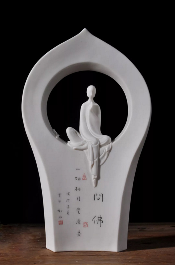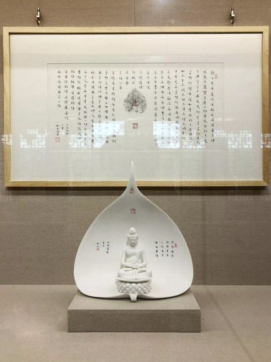 陶瓷與書法都是中華民族的傳統(tǒng)藝術(shù)。陶瓷是泥與火的藝術(shù),書法是筆含墨的藝術(shù)。從本質(zhì)來(lái)講,兩者有相通之處,有著許多共同的文化內(nèi)涵和相通的藝術(shù)特征。德化白瓷具有胎體致密、透明度高、釉色潔白、溫潤(rùn)細(xì)膩、凝脂似玉的特點(diǎn)。展品便充分利用書法的形式美和德化白瓷這種材質(zhì)美以及在文化內(nèi)涵上的聯(lián)系,和諧而自然地結(jié)合。