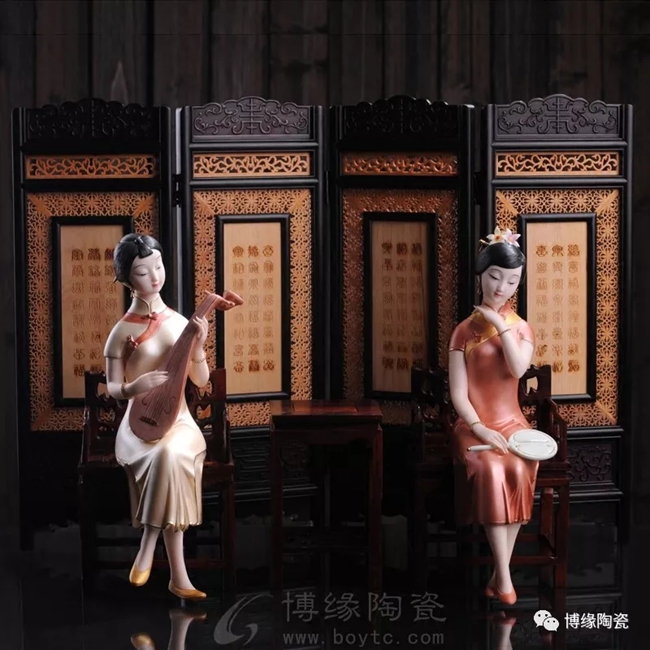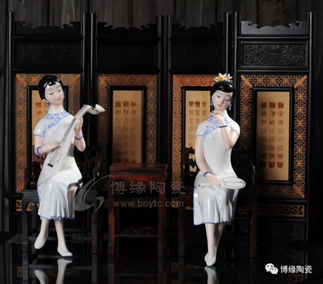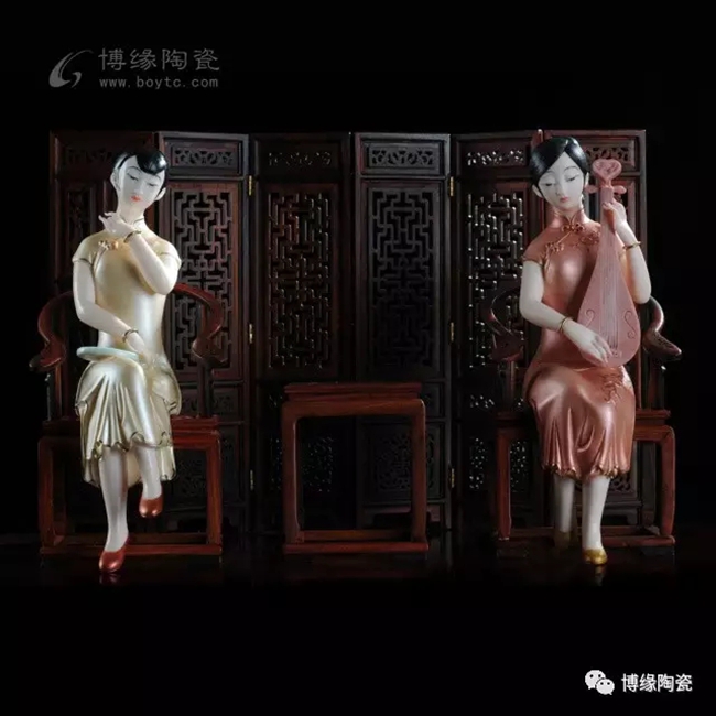 “仕女”是人物類陶瓷作品常見的題材之一,“仕女”本意是指官宦家的女子,而在工藝美術(shù)中是泛指所有古裝青年女子。還有別稱為“美女”或“古美”,即古代美人。這一名稱包括了我國神話傳說、歷史傳記和小說戲曲中的古裝女子形象,比如“嫦娥”、“西施”、“楊貴妃”、“王昭君”以及《紅樓夢》中眾多的女子等等,都是膾炙人口的、為大眾所喜聞樂見的仕女題材。