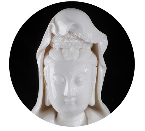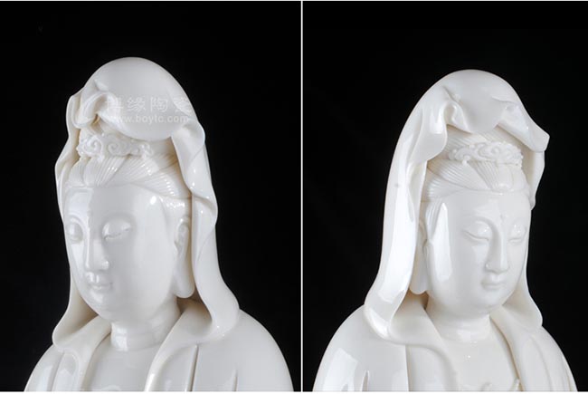 坐巖觀音為明代福建德化窯的典型產(chǎn)品。觀音髻上頂戴如意花冠,容顏豐腴端莊,五官清秀細(xì)膩,雙眼低垂,似凝神靜思,表現(xiàn)出安然慈祥的表情,端莊典雅,令人肅然起敬。