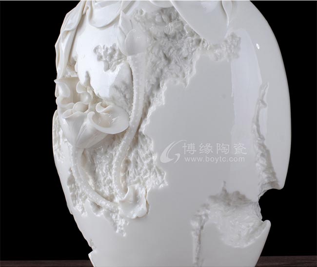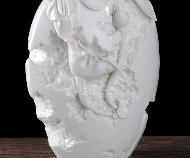 巖石的制作凹凸奇兀,手法不落俗套,極其工致,巖石上的荷花純手工捏制,栩栩如生,一只荷花只開了一半,另一只荷花含苞待放,就如隱約朦朧的朝陽,充滿希望。