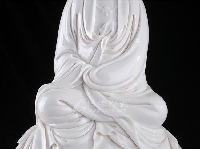 觀音坐于巖石上,著袒領(lǐng)寬袖衣,胸前飾串珠,把面龐烘托得越發(fā)秀潤嫻靜。整件雕塑衣褶層次清晰,自然舒卷,流暢飄拂。