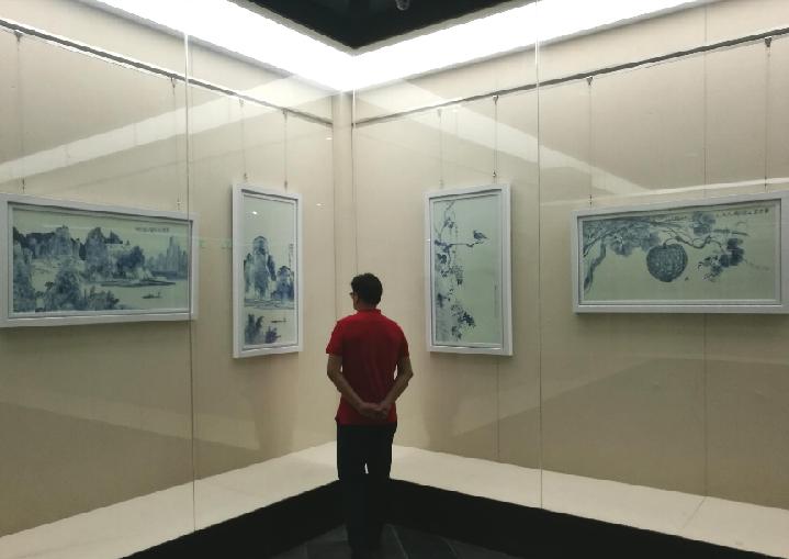 本次展出的瓷畫作品,是馬光耀從國畫中尋找文化精神、表現(xiàn)技法,來表現(xiàn)其頗為獨道的筆情墨趣。馬耀光的作品題材廣泛山水,花鳥,人物無不涉獵。有工、有寫、有巨制、也有小品。表現(xiàn)形式也多樣,新彩、粉彩、青花一應俱全,尤擅青花。馬耀光在青花方面自有獨到之處,他可把青花料用到極致,發(fā)出墨彩,讓觀者感受到料質(zhì)的奇妙變化。馬耀光的青花作品在光澤、潤韻、層次、彩暉方面有過人之處,特別耐人尋味。馬光耀的老師郭汝愚說,“我相信他構圖的多樣,題材的廣泛,色彩的水潤與光澤,將會給觀者留下深刻的印象。”