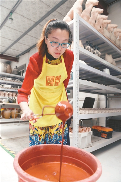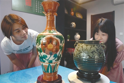 說(shuō)自己的經(jīng)歷,孫天舒很動(dòng)情感:“很多人說(shuō)我選擇了一條最難的路,的確與泥料為伴的日日夜夜中,我經(jīng)歷了常人難以忍受的苦。”經(jīng)過一番努力,孫天舒在關(guān)濤教授指導(dǎo)下,根據(jù)遼瓷斷代前的造型工藝,恢復(fù)出制瓷工藝的流程,包括練泥、拉坯、印坯、利坯、曬坯、刻、劃、剔、素?zé)、點(diǎn)彩、施釉、釉燒等。在造型方面,依據(jù)契丹族遼瓷的獨(dú)有器型,進(jìn)行1:1等比例恢復(fù),包括鳳首瓶、皮囊壺、寶葫蘆、交頸鴛鴦壺、雞腿壇、摩羯壺、魚形壺、馬蹬壺等。“做一批作品需要三四個(gè)月,幸運(yùn)的話能出一件成品,有時(shí)候幾百件里出一件,可謂‘百里挑一’。”