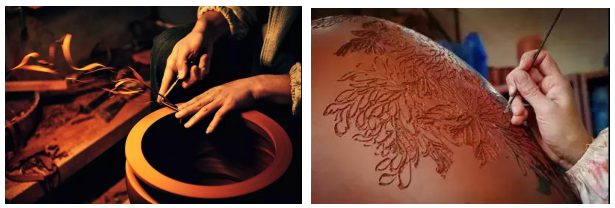 在建水紫陶鍛造打磨的過程中,刻坯填泥和無(wú)釉磨光技術(shù)是其最重要的工藝?膛魈钅嗟倪^程講究細(xì)心與耐心,它要求紫陶匠人在初具形狀的陶器上以刀為筆,將陶藝大師在陶坯上的書畫創(chuàng)作完美呈現(xiàn),紫陶工藝大師田靜介紹說,“刻坯填泥的工藝并不容易掌握,匠人須熟練地控制刀法與力度,或陰刻、或陽(yáng)填,稍有不慎就會(huì)前功盡棄。”千年的時(shí)光在匠人的指縫間流過,手起刀落間游龍走鳳,一件件精美的紫陶作品逐漸誕生。