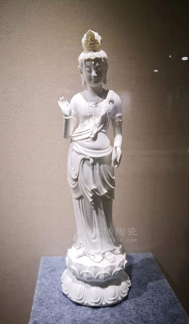 80多件白瓷精品潔白細膩,釉質(zhì)如玉,傳統(tǒng)藝術(shù)作品與富有時代氣息的新作品同臺亮相。展出作品當中既有形神兼?zhèn)涞娜宋锼芟瘢钟星f重典雅的陳設(shè)供器,還有精巧別致的日用器皿,是德化白瓷作品的一次集中展示。