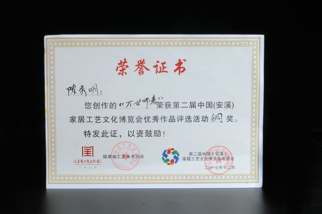 2017年12月,作品《萬世師表》榮獲第二屆中國(安溪)家居工藝文化博覽會優(yōu)秀作品評選活動銅獎。