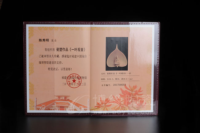 2017年12月,作品《一葉觀音》被福建中國閩臺緣博物館永久珍藏。