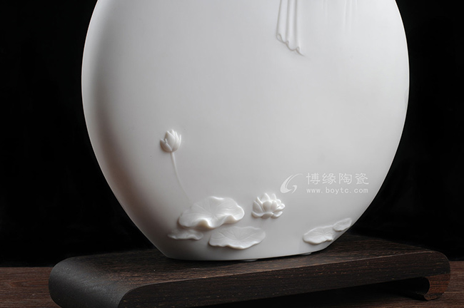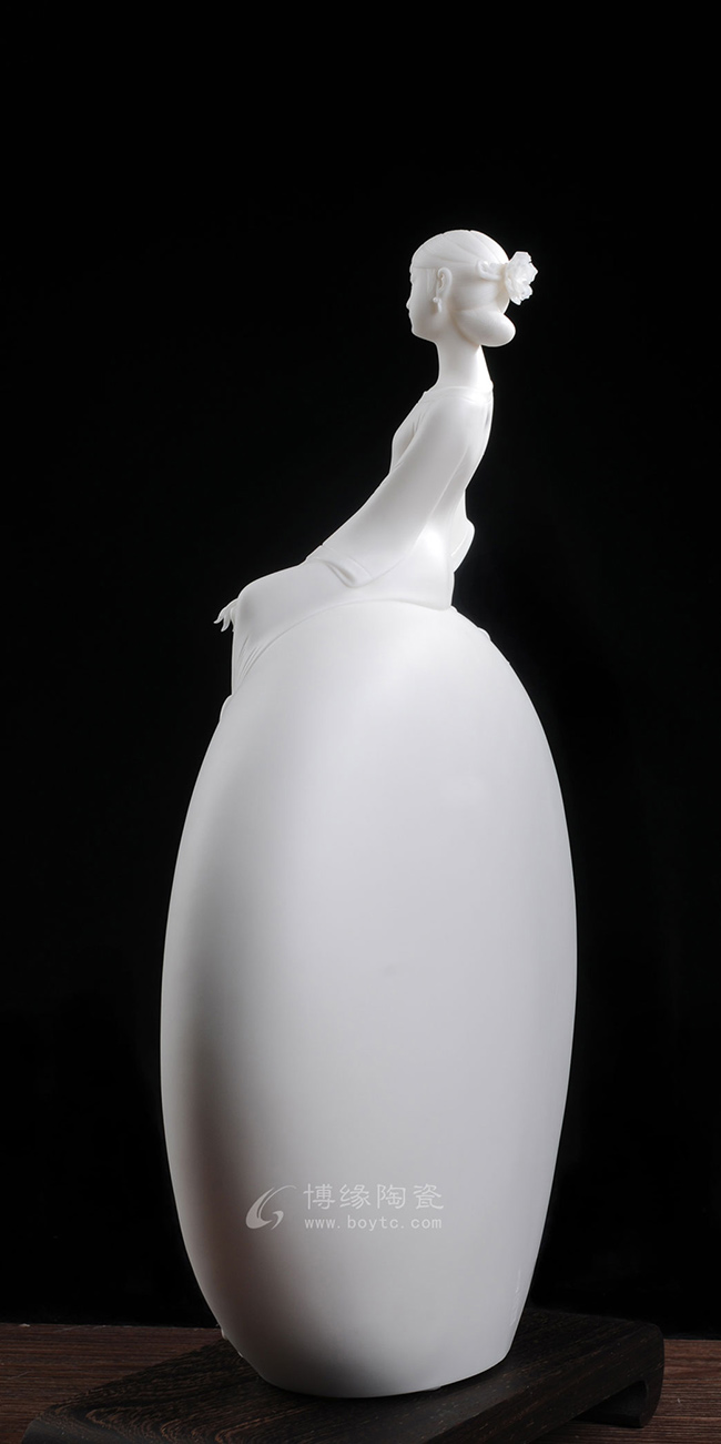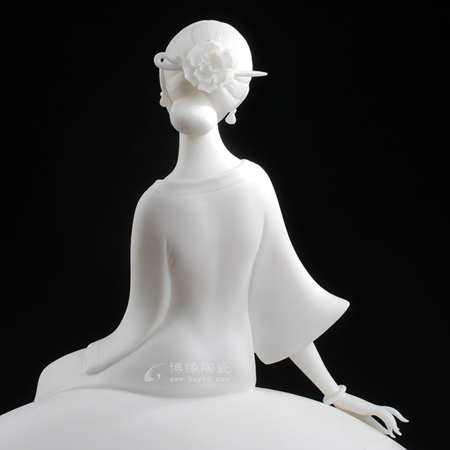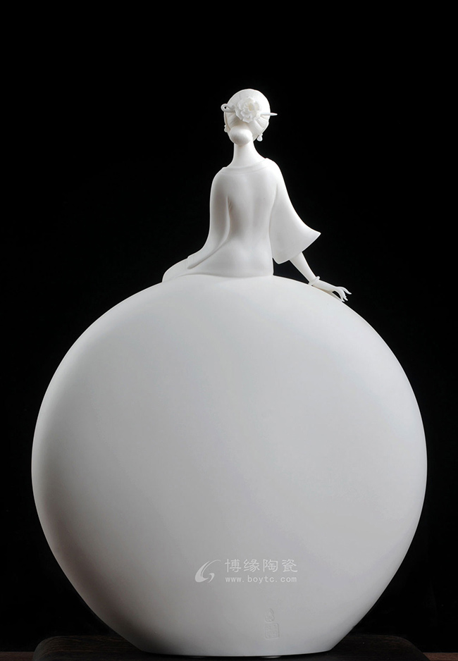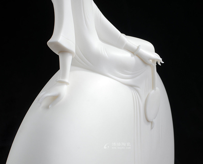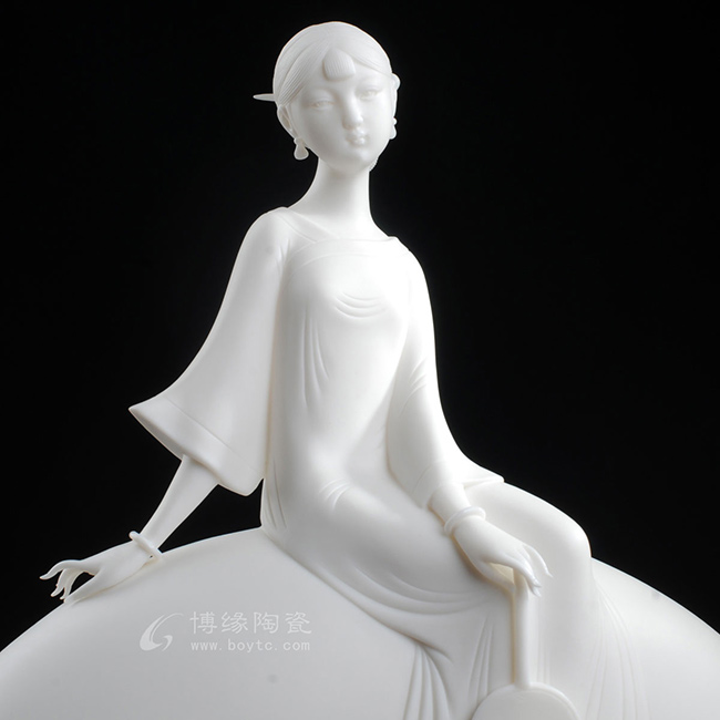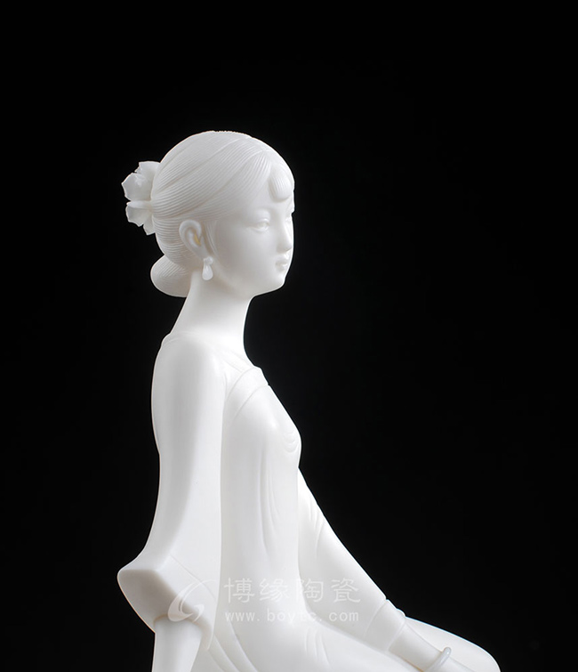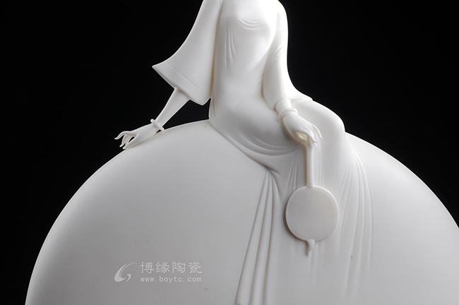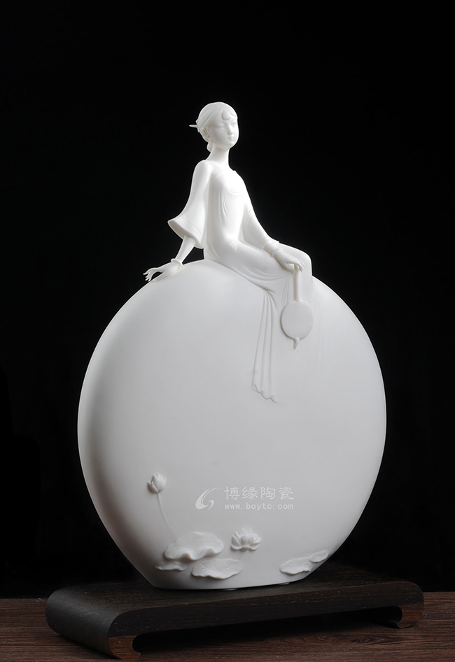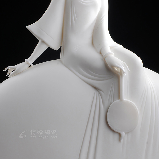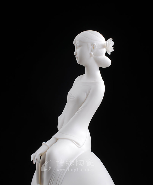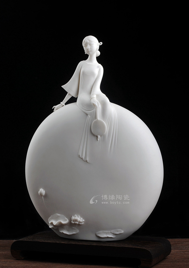 作品《望江南》以德化白瓷為表現(xiàn)形式,描繪了女子手拿扇子坐于荷圓上,盼望歸人的情景;女子眉眼纖細(xì)、神態(tài)安然祥和,從衣裙、動(dòng)態(tài)中傳達(dá)出東方女子的溫柔閑雅、清淡秀媚、如詩如畫。