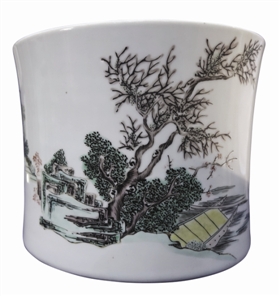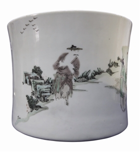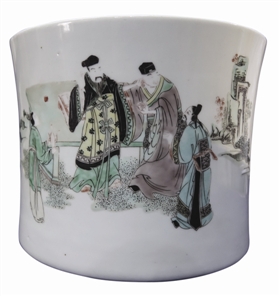 這只筆筒,也最能體現(xiàn)康熙古彩瓷紋飾與裝飾特色,山水人物層次鮮明,濃淡相宜,艷而不俗,人物姿情出神入化,有一種難能的雅致。小畫大道理,簡筆大意境,能夠巧妙地把人物與生活現(xiàn)實(shí)場景、人與人、與自然景色融為一體,使瓷畫在幾寸之間,彌散著豐富的生活情趣,表達(dá)了人們對(duì)美好生活的向往或?qū)θ嗽谋迵。這應(yīng)該是康熙五彩瓷、古彩瓷的一大特點(diǎn)。有專家曾說,康熙古彩瓷以五色爭艷、富麗堂皇、高貴典雅、鐵線銀勾而居瓷畫藝術(shù)之首,以工藝嚴(yán)謹(jǐn)、形象概括、構(gòu)圖新穎、古樸灑脫,而居釉上彩之大宗。此言不虛。