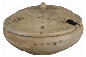 成熟的青瓷是在原始青瓷的基礎(chǔ)上發(fā)展而來,最早出現(xiàn)于東漢時期,此后的三國兩晉南北朝時期是青瓷發(fā)展的重要階段,其產(chǎn)地主要集中在我國南方的浙江地區(qū),包括越窯、甌窯、婺州窯等,以越窯青瓷產(chǎn)品質(zhì)量最高,數(shù)量也最多。而同時期的甌窯青瓷,也具有自身特點(diǎn),尤其以青釉點(diǎn)褐彩產(chǎn)品最具特色,這里來介紹一件甌窯青釉點(diǎn)褐彩蓋盒(見圖)。