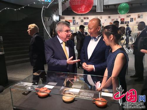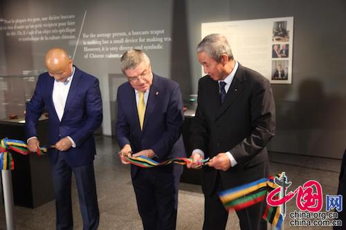 7月31日,國際奧委會(huì)主席巴赫(中)、國際奧委會(huì)副主席于再清(右)與呂俊杰為藝術(shù)展剪彩。