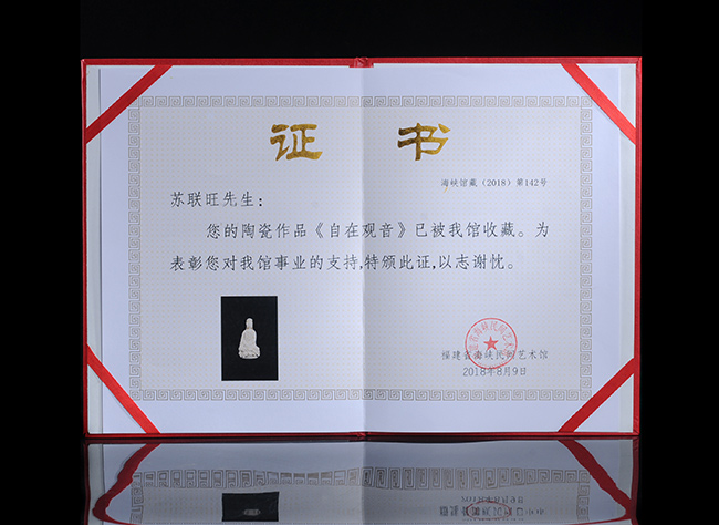 2018年8月,蘇聯(lián)旺瓷塑作品《自在觀音》被福建省海峽民間藝術(shù)館永久收藏。