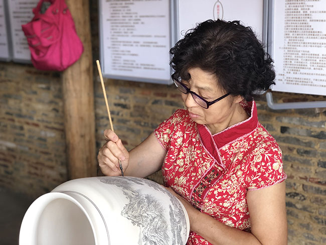 省級非物質(zhì)文化遺產(chǎn)傳承人袁寧霞在陶瓷坯體上描繪紋飾