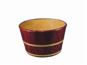 有關(guān)木理紋器,汪慶正在其主編的《簡明陶瓷詞典》中云:“清代雍正、乾隆年間,景德鎮(zhèn)官窯以紅、黑兩種不同的釉色繪成木理紋,有的還作藤條緊固裝飾,制作十分逼真,遠(yuǎn)看乍望儼若木制器皿。常見器物有筆筒、筆擱等小件,也有大型的仿木桶。并有以木紋釉作座子配粉彩、茶葉末等花盆、瓶、缸等器物。”