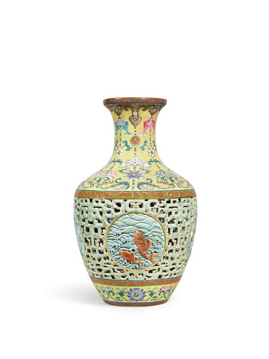 香港蘇富比(微博)宣布,乾隆洋彩黃地粉青透龍夾層吉慶有余玲瓏尊將為 2018 年中國藝術品秋拍揭開序幕。此玲瓏尊曾著錄于 1905 年紐約山中商會圖錄,自 1924 年納入日本私人收藏近 一世紀。頸上黃地錦上添花,溢洛可可洋風,四面浮雕開光,各綴雙魚栩栩如生,從外瓶鏤空夔龍紋,可窺 內瓶青花纏枝花卉,妙然生趣。此品制作殊艱,為御窯督陶官唐英所制最巧奪天工瓷器之一,與 2010 年以 4,300 萬英鎊落槌的著名乾隆洋彩玲瓏尊成對,誠乾隆重器。