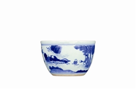 缸口徑12.7厘米;唇口,直壁下收至底,足露胎較高,質地堅致。器身里外罩透明釉,釉汁細潤潔白。外壁繪儒生林間小憩,仆人一爐邊煮茶,一侍立,四周林木茂盛,浮云飄渺。構圖疏密得體,青花呈色濃艷,造型端莊典雅。畫面清晰,惟尺寸較小,顯然為清心養(yǎng)性的賞玩之物。