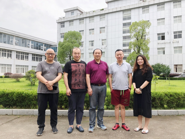中宇力度文化有限公司董事長(zhǎng)、中國(guó)知名相聲演員卓林等一行與景德鎮(zhèn)景東陶瓷集團(tuán)有限公司董事長(zhǎng)張曉東在張茂松陶瓷研究院內(nèi)合影