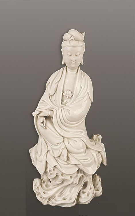 明清德化白瓷中以人物塑像最為豐富、也最具代表性,尤以佛、道人物居多,主要有觀音、佛像、羅漢、達摩、八仙、福祿壽三星、李白、童子像等。人物塑像胎釉潔白細膩、溫潤晶瑩,衣紋生動飄逸,表情溫和含蓄。