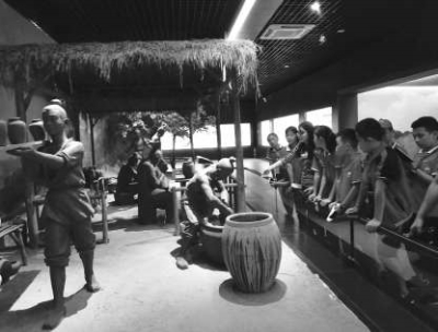 沿著這面地圖往右邊走,小記者見(jiàn)到一幅栩栩如生的古代人燒制陶瓷技藝的畫面,從這幅畫面我了解到了陶瓷的制作技藝。熱情的講解員還跟大家介紹了有關(guān)古代陶瓷的做法,古時(shí)候制作陶瓷工程煩瑣,全靠人工勞動(dòng)得來(lái),得先采礦取土,然后水硾粉碎,再淘洗沉淀,踏踩煉泥……總共給要經(jīng)過(guò)12道工序才能完成,聽(tīng)完介紹,讓人不禁為古代人的智慧與勤勞鼓掌!