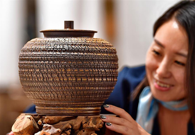 9月16日,觀眾在第二十一屆唐山中國陶瓷博覽會(huì)上欣賞一件作品。