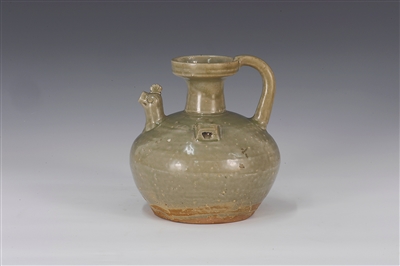海南省博物館收藏有一件青釉雞首壺,該壺盤口,束頸,溜肩,鼓腹,平底,底部還有七個明顯的墊燒痕。肩部一側(cè)置雞首流,雞首高聳,雙目圓睜,口部圓張;對側(cè)置一圓弧柄,兩側(cè)橫置對稱的橋形系。胎質(zhì)呈青灰色,火石紅比較明顯。整體施以青釉,底部不施釉。由釉色、胎質(zhì)和造型等來看,應(yīng)是東晉時期越窯的產(chǎn)品。