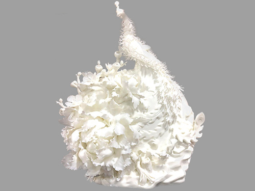 “孩兒紅”之丹鳳朝陽,匠心所運,巧用堆、推、雕、刻、捏、刮、接、貼等精制手法,綿柔堅致,潔白高雅,猶如雪凍霜凝,精致處更是細如毫發(fā)、絲絲可鑒。呈色溫潤如玉,剔透光滑,光線照耀,映見指影。深具明代瓷雕大家何朝宗“何派”風格,展現瓷都千年藝術經典傳承。