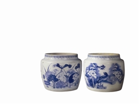 罐高17.4、口徑16.2、足徑16.5厘米。開光圖案為兩幅,一幅以喜鵲與梅花為飾(圖1),喜鵲寓意喜慶,梅花呈五瓣,有“梅開五福來”之意,五福即一謂壽,二謂富,三謂康寧,四謂修好德,五謂考終命;一幅畫以鷺鷥與蓮荷(圖2),借“鷺”與“路”音同,“蓮”與“連”諧音,贊頌鴻運(yùn)高照、連中三科(鄉(xiāng)試、會試及殿試的頭名)。紋樣為康熙朝晚期習(xí)見,反映出一番國泰民安氣象。