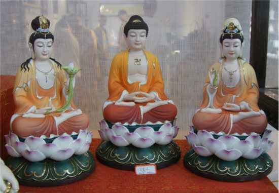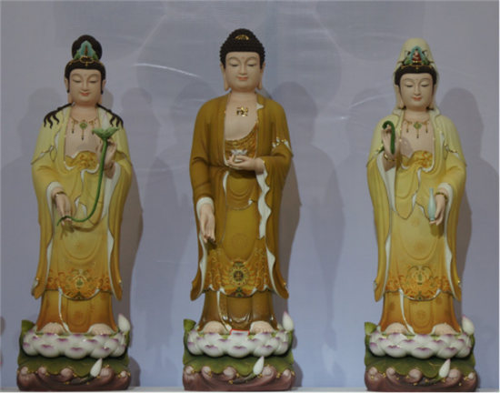 郭桂星介紹,西方三圣又稱彌陀三尊,指的是西方極樂世界三尊主要的佛菩薩,即教主阿彌陀佛和他的左脅侍觀世音菩薩、右脅侍大勢至菩薩。造像上,三者皆在蓮座上,蓮象征出淤泥而不染,于一真法界而能應(yīng)化在十法界;阿彌陀佛居中,觀音菩薩脅侍在左,大勢至菩薩脅侍在右。三者塑像或畫像為修行凈土宗者禮敬的對象。