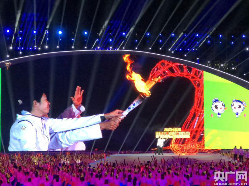 10月28日,江西省第十五屆省運會在景德鎮(zhèn)市隆重開幕。開幕式上,古窯把樁師傅胡家旺作為最后一棒火炬手,莊嚴地點燃了“朱雀”口銜的火柄,“朱雀”騰空而起與無人機相會,最終點燃了聳立在體育場上的主火炬,全場沸騰了!