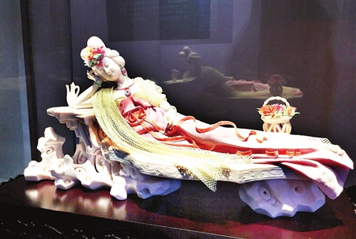 記者在現(xiàn)場(chǎng)看到一件山花陶瓷作品《貴妃醉酒》,只見(jiàn)貴妃斜臥,身披網(wǎng)紗,衣帶飄飄,精致動(dòng)人。這件作品的作者是德化高級(jí)工藝美術(shù)大師鄭雄文先生的弟弟鄭雄彭先生。他告訴記者,貴妃身上的網(wǎng)紗和頭上的牡丹,很多觀眾會(huì)覺(jué)得是塑料制作的,其實(shí),她通身都是陶瓷,且所有的顏色是燒制出來(lái)的,而不是后來(lái)加彩,這正是山花彩的獨(dú)特工藝。