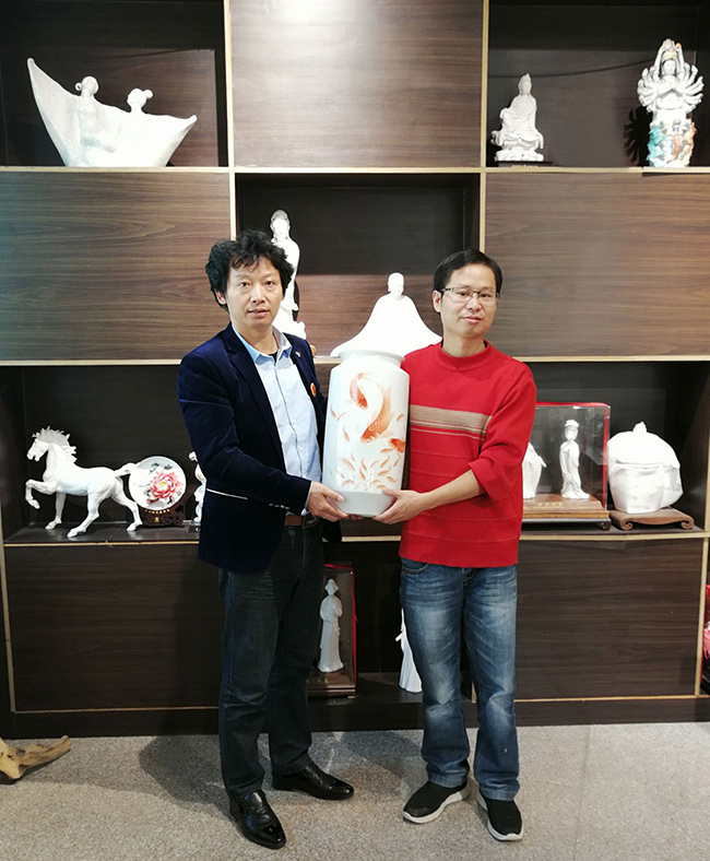 近日,景德鎮(zhèn)市國(guó)匯陶瓷藝術(shù)名家協(xié)會(huì)會(huì)長(zhǎng)、風(fēng)火仙師童賓第十九代傳人——童義春,蒞臨德化博緣陶瓷指導(dǎo)交流并饋贈(zèng)其佳作《年年有余》;博緣陶瓷總經(jīng)理柯維太熱情接待,并與童義春大師積極探討陶瓷創(chuàng)作與未來(lái)發(fā)展。