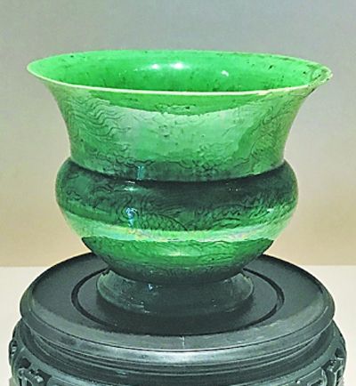 瓜皮綠釉錐拱云鳳紋渣斗(陶瓷)