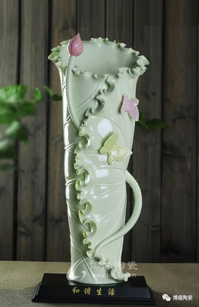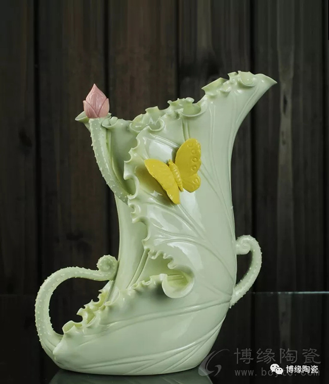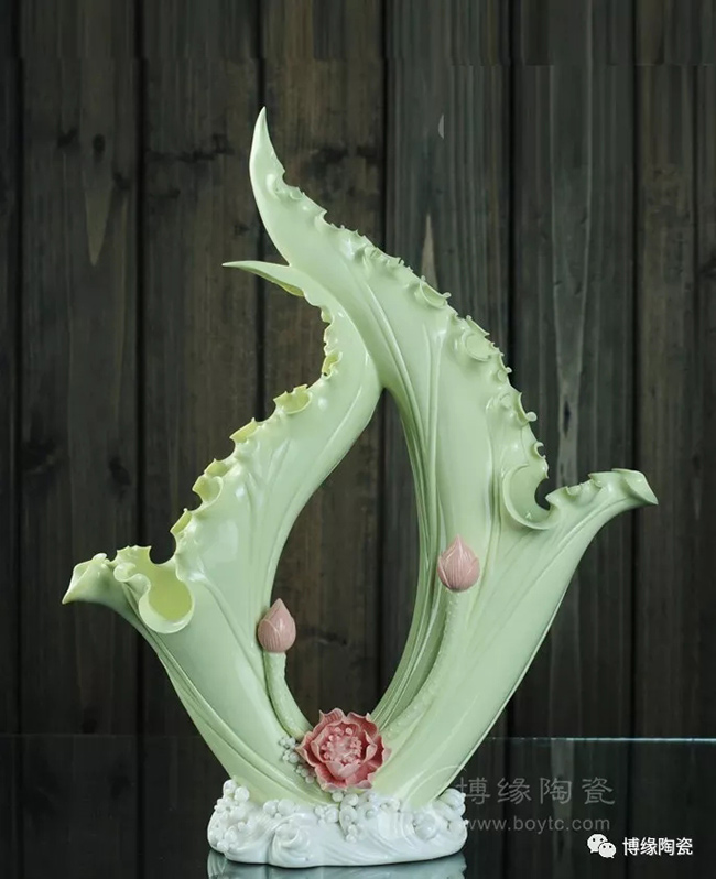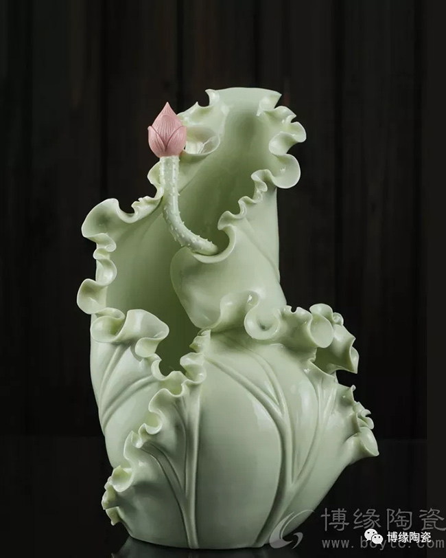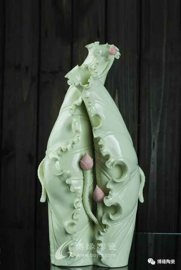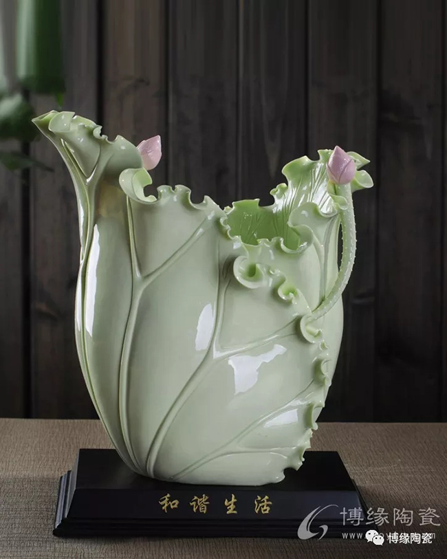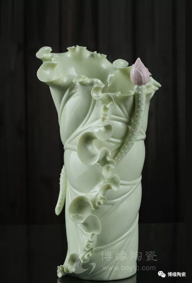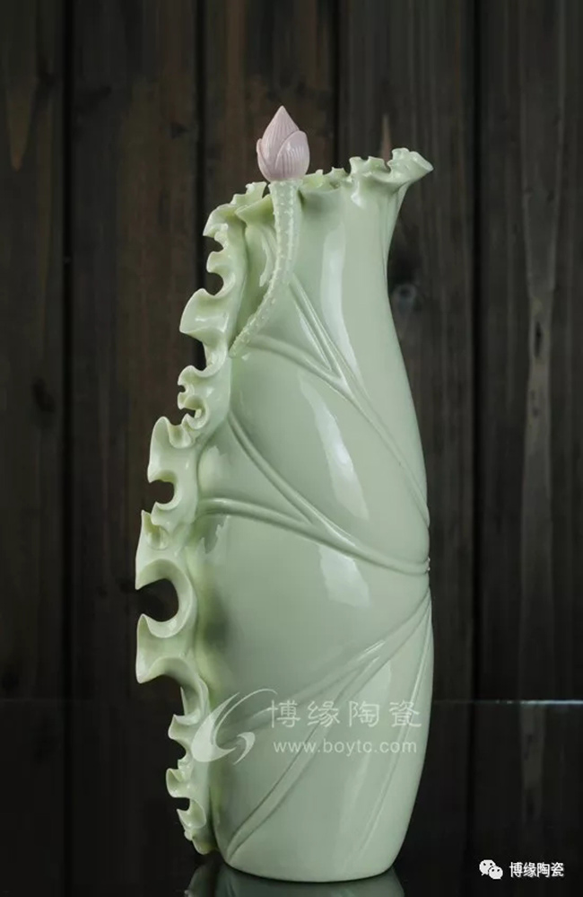 《荷葉瓶》以荷葉為主體,外形呈一片上卷的荷葉,口沿外卷,自然翹曲,呈不規(guī)則的連幅弧型,葉脈清晰;以小荷花苞為點綴的花瓶,造型優(yōu)美,清新素雅。