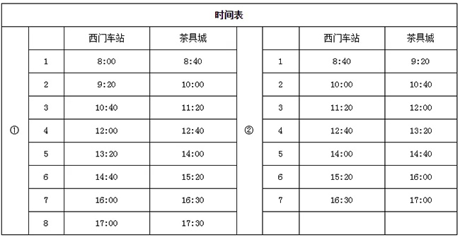 根據(jù)縣政府及交通主管部門的要求,為滿足第一屆茶博會(huì)群眾出行的交通需求,2018年12月19日至23日,我司開通一條臨時(shí)公交線路,由西門車站發(fā)車,途徑丁溪橋、南門、一實(shí)小、南環(huán)公寓、嘉盛花苑、寶美職工公寓、寶美開發(fā)區(qū)、銀晟陶瓷,終點(diǎn)為茶具城的公交線路。票價(jià):一票制2元。具體發(fā)車時(shí)間表如下: