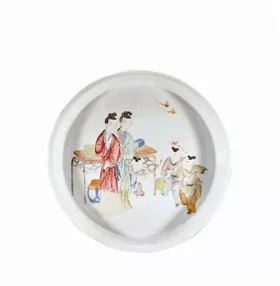 如圖所示是一件清雍正粉彩二喬人物故事盤,徑25厘米,敞口,弧腹,圈足。通體施透明釉,釉面滋潤勻凈,平滑瑩白,光潔無瑕。盤心所繪“二喬戲嬰圖”。只見二喬站立,三嬰孩嬉戲其間。身旁家具描繪細致入微,結構繪畫極為寫實,書案上擱置書籍,書案下置鼓凳。整個畫面生動展示了雍正時期制瓷匠人對于二喬容貌及其生活場景的遐想,令人過目難忘。