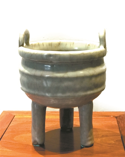 據(jù)主辦方介紹,本次展品中有不少藏品是國(guó)家館藏和民間藏家收藏的宋瓷精品。其中一件南宋官窯粉青釉鼎式爐價(jià)值高達(dá)千萬(wàn)元。據(jù)藏家稱(chēng),此件官窯瓷器施粉青釉,釉面滿(mǎn)開(kāi)細(xì)片,鼎式古樸,造型典雅高貴,受宋代皇室崇古尚禮之風(fēng)影響頗深,是宋代官窯的珍品。