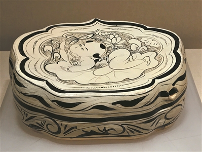 金磁州窯白地黑彩嬰戲蓮紋如意形枕