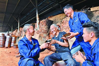 福建省建甌市北苑皇綱工藝廠85歲的陶瓷藝人黃志松(左二)在查看工人燒制的建盞。新華社發(fā)