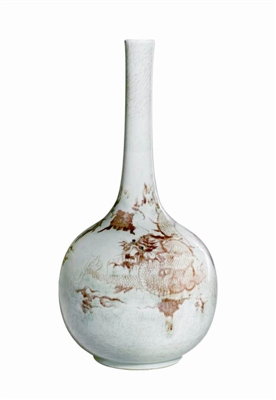 圖1所示這件清雍正釉里紅龍紋油錘瓶,高42.5、口徑4、足徑11厘米,通體飾淡青釉,頸口及器身局部釉面有細(xì)開片,釉色瑩潤(rùn)。腹部以釉里紅描繪一四爪蛟龍,周圍飾以云氣及火焰,圖案充滿動(dòng)勢(shì)。主體圖案之外,器身無過多裝飾,簡(jiǎn)練明快,整體配色柔和。圈足刮釉露胎,外底白釉無款。油錘瓶是瓶的一種式樣。器型大多小口,細(xì)長(zhǎng)頸,圓腹,圈足,形似榨油作坊用的油錘,故名。這件雍正朝釉里紅油錘瓶發(fā)色純正,品相極佳,現(xiàn)收藏在清華大學(xué)藝術(shù)博物館。