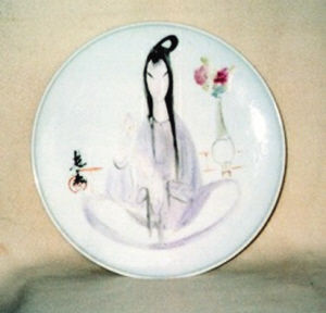 1964年,沈智毅陪畫家唐云、林風眠、朱屺瞻等赴江西景德鎮(zhèn)蹲點繪瓷。這期間,林風眠為沈智毅在十寸瓷盤上畫了《仕女圖》:瓷盤上仕女盤膝而坐,手持鮮花,嫵媚溫馨,優(yōu)雅文靜。線描勻細,圓潤、飄逸的曲線美,令人羨愛。唐云除了在瓷缸蓋上為沈智毅畫了蝴蝶花之外,還在十寸的瓷盤上畫了《水仙麻雀》:翠綠為裙的水仙,梢頭數(shù)朵白底黃心的花蕊,清姿幽香,水仙旁有一大青石,麻雀站立于上翹首自樂,沈智毅說:“此乃唐云瓷盤畫中的精品,他是用著心為我畫的。”在景德鎮(zhèn),沈智毅一面照顧畫家,一面偷閑學(xué)畫。他說:“那時我學(xué)到了兩樣本領(lǐng),一是林風眠用紙撳畫及用牙簽刮畫的本領(lǐng)。二是掌握了畫瓷的顏料、調(diào)色以及基本材料的運用。”沈智毅發(fā)現(xiàn)請名家在瓷盤上畫些小品,用作市領(lǐng)導(dǎo)出訪禮品,效果很好。于是他帶回了許多畫瓷材料。正巧,時任領(lǐng)導(dǎo)王一平要出訪日本,希望上海美術(shù)館請一批畫家畫一批瓷盤,于是沈智毅策劃了十大名家畫瓷盤的活動;顒雍艹晒,燒制了近十套瓷盤。