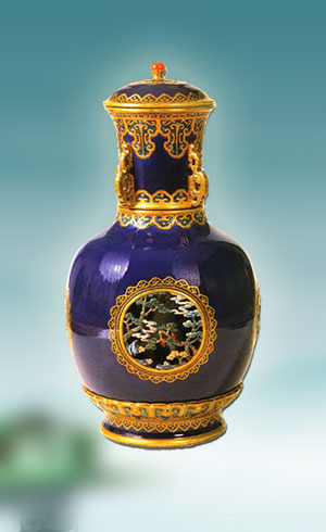 藍釉描金粉彩開光轉(zhuǎn)心瓶
