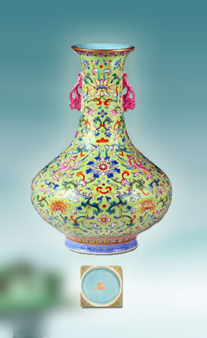 頸部貼朱雀形雙耳, 內(nèi)施湖綠釉,外翠綠釉上繪粉彩雙鳳穿花紋。底書“大清乾隆年制”六字礬紅篆書款。此瓶紋飾精細,釉色鮮艷,較為罕見。