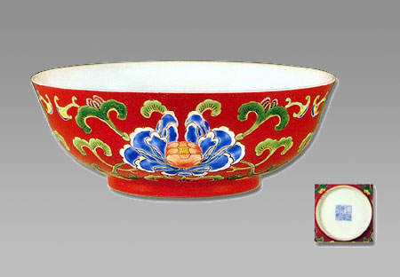 琺瑯彩是康熙、雍正、乾隆三朝宮廷燒制的名貴品種。此碗在紫色的胭脂釉上繪綠色的枝葉、藍色的花瓣、紅色的花蕾、黃色的花心, 色澤濃艷華貴。